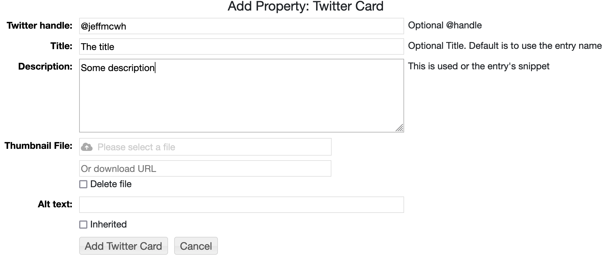 <meta name="twitter:card" content="summary_large_image"> <meta name="twitter:title" content="Salton Sea"> <meta name="twitter:description" content="This is an example..."> <meta name="twitter:image" content="https://ramadda.org/repository/metadata/view/Screenshot_2023-09-25_at_08-12-53_Salton_Sea_Map.png?element=1&entryid=0e3af72d-8be7-4f9d-933d-983fad440bba&metadata_id=b96d579f-d914-4d8a-bb04-78c5896a8243"> <meta name="twitter:creator" content="@jeffmcwh">By default the name of the entry is used for the title. If the entry has a Thumbnail image property attached to it then the Twitter Card will be an image. If the entry is an Image then the image will be used. Else it will just be a text summary. The entry's snippet is used for the description. There is also a Twitter Card property type that can be used to specify the title, creator, description and image. Under Add Property->Miscellaneous add the Twitter Card property: Enter any of the values. If defined in the property these will override the defaults of the entry's name, snippet, etc. These properties can be inherited. For example, you can add an inherited Twitter Card property at the top-level of your repository with just the Twitter handle specified. Then for any descendent entry you can specify a title, thumbnail, etc. To disable this set the following property in one of the .properties files in your RAMADDA home directory: