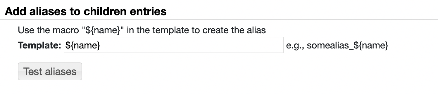 Scroll down to the "Add aliases for children entries" section and provide the template with the ${name} macro. The name will be a cleaned up version (lower case, no spaces, no special characters) of each entry name:
