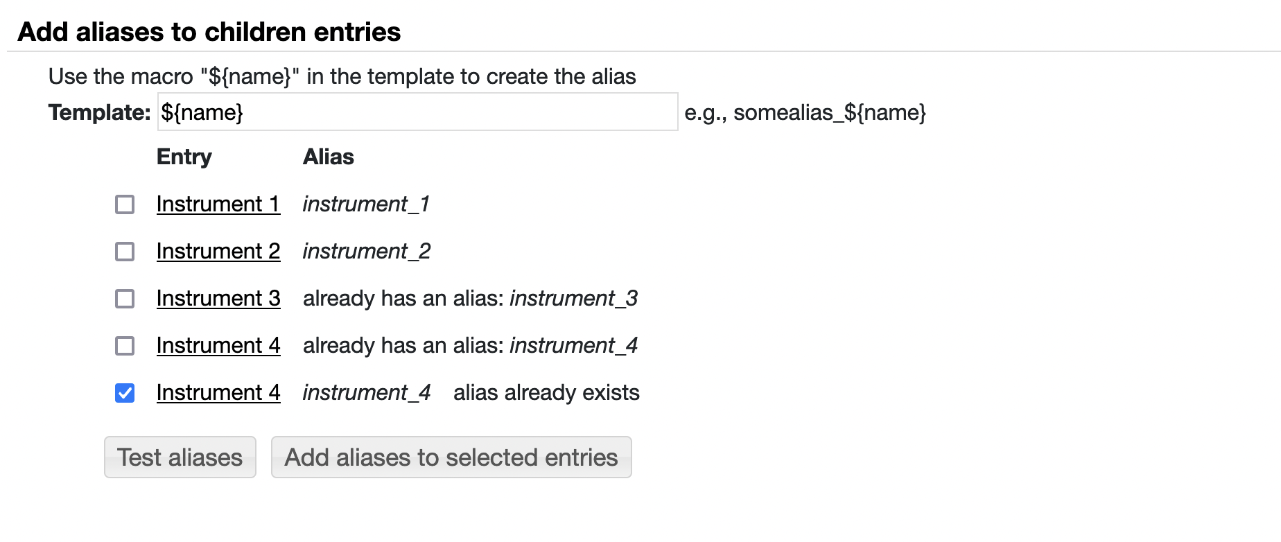 Initially no aliases will be added. Select the entries you want an alias for and press "Add aliases to selected entries".