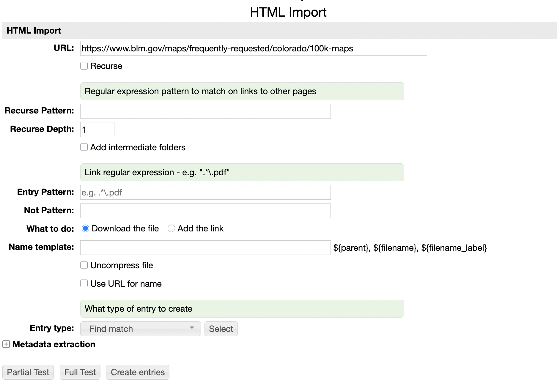 - Partial Test, Full Test, Create Entries - It is best to do a Test before creating entries. The Partial Test will just try a small number of pages and list the results. The Full Test will process all pages.