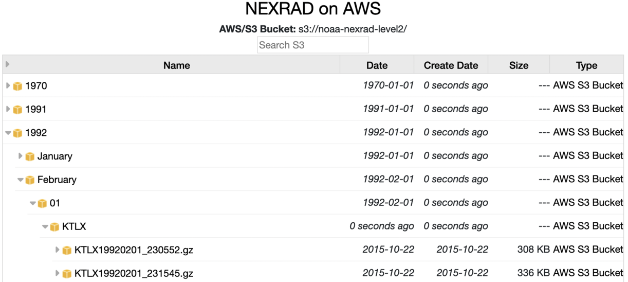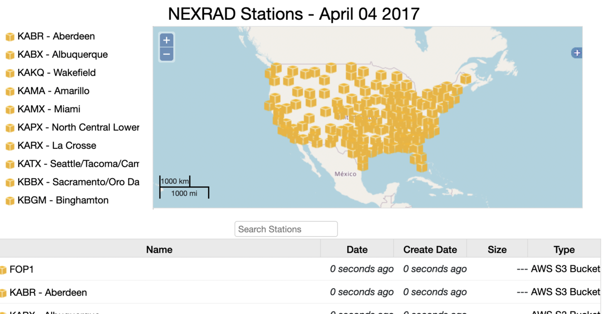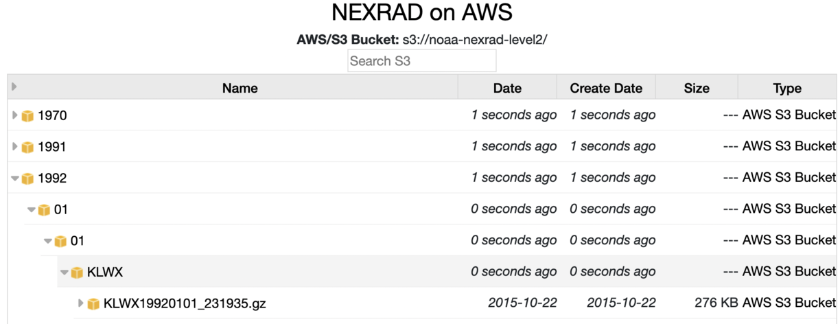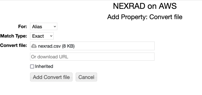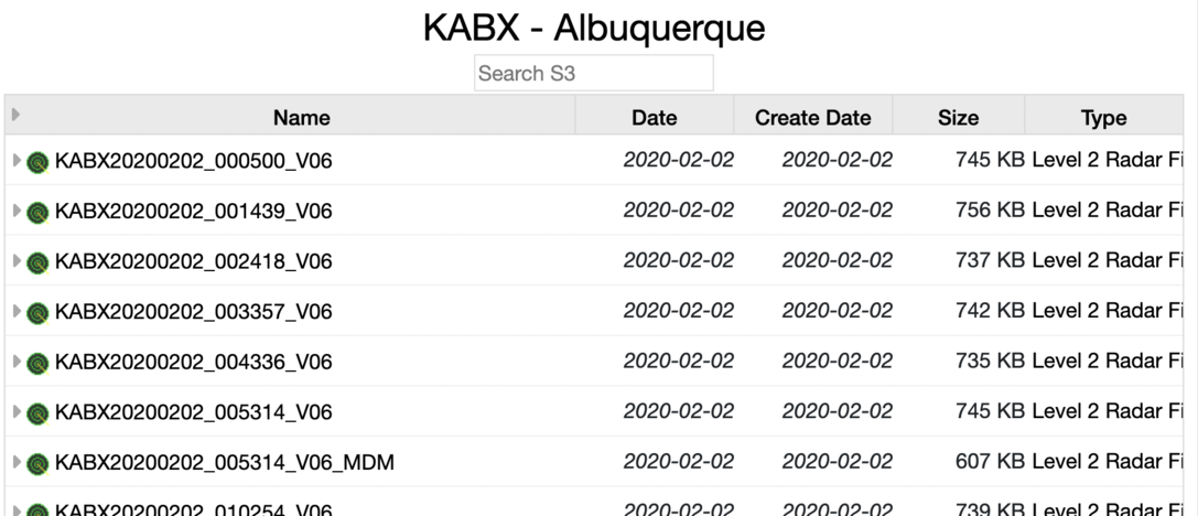 id,fullname,lat,lon KAPD,KAPD - Fairbanks/Pedro Dome,65.035,-147.50167 KAEC,KAEC - Fairbanks/Nome,64.51139,-165.295 KACG,KACG - Juneau/Sitka,56.85278,-135.52917 KAIH,KAIH - Anchorage/Middleton Island,59.46139,-146.30306 ...The first column is the station ID and this is used to match up (either exact or pattern) with the S3 folders. Upload the nexrad.csv file and select Alias and Exact: Now, the station folders have the full name. Next, upload the same file and select "Location". This adds the spatial metadata to the station folders.