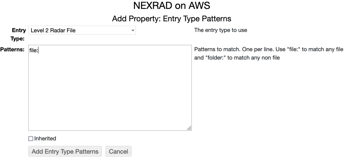 ^\d\d/\d\d$The first line is a pattern that matches NN/NN, i.e., the month/day folder names. The remainder of the file is the wiki text to be used for the folders that match the pattern. Upload this file, select "Template" and for match type select "Pattern". Now, for the day folder we should have: And finally, we want to show the files as "Level 3 Radar" files, a file format that RAMADDA provides. To do this go to the Add Properties menu and under Miscellaneous select "Entry Type Patterns". This property allows you to specify an entry type (e.g., Level 2 Radar File) and one or more patterns to match. For the NEXRAD data collection we know that all of the files are of this type so we specify as a pattern "file:" Now, with that the files should be shown as this entry type:+section title="NEXRAD Stations - { {name entry=parent} } { {name} } { {name entry=grandparent} }" +inset left=20px right=20px { {map listentries=true hideIfNoLocations=true} } ...