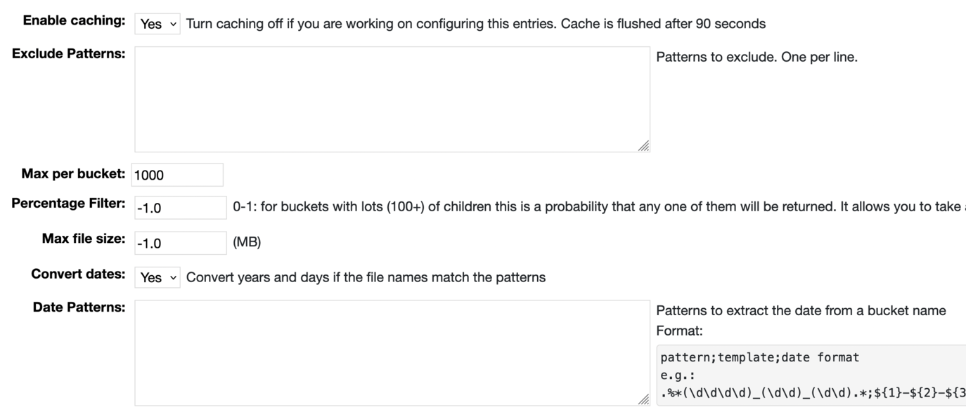 After adding the entry you can edit it to configure how the S3 buckets are displayed.pattern;template;date formatand is used to match against a folder or file name. The pattern needs to contain "(...)" groups. If it matches then the matching groups are extracted and the template (the 2nd part of the 3-tuple) is used to create a date string. This date string is then parsed by the date format.