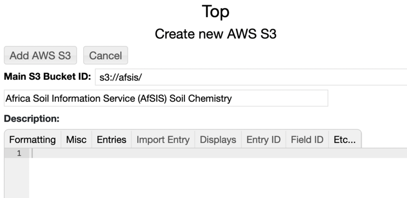 To create a new S3 entry go to the File->Pick a Type menu and select "AWS S3". In the create form entry the S3 URL, a name and an optional description: