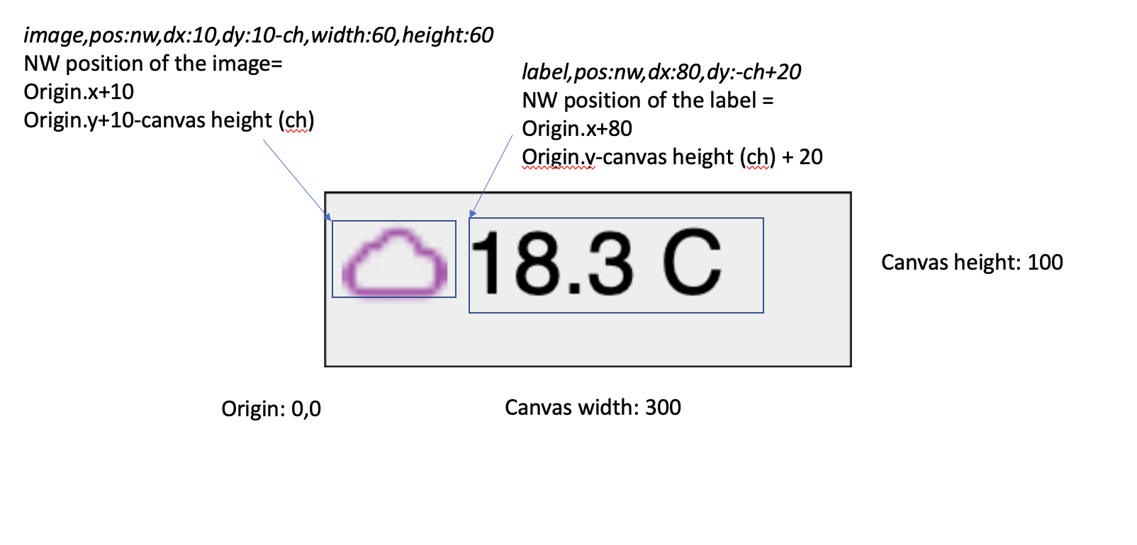 label,pos:c,dx:cw2,dy:ch2,label:Some labelIf you want to have a label that is position in the upper right of a canvas of width and height 100. To do this specify the following. The dy=-90 takes into account the approximate height of the text block.
