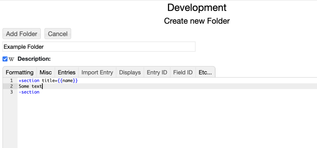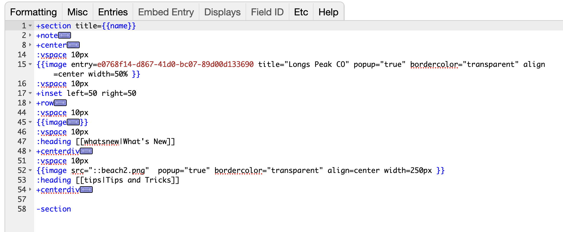 - Formatting - Basic wiki text formatting - sections, tabs, accoridion, slides, notes, etc.