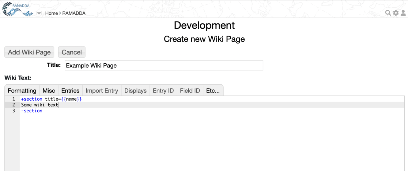 | RAMADDA uses wiki text in a number of ways. You can create Wiki Page entries, you